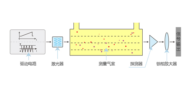 可調(diào)諧半導(dǎo)體激光吸收光譜法(TDLAS),是利用半導(dǎo)體激光器的波長(zhǎng)調(diào)諧特性和待測(cè)氣體對(duì)激光的選擇性吸收進(jìn)行氣體濃度檢測(cè)的一種技術(shù)。具有高靈敏度、實(shí)時(shí)、動(dòng)態(tài)、多組分同時(shí)測(cè)量的優(yōu)點(diǎn)。其原理是可調(diào)諧半導(dǎo)體激光器在驅(qū)動(dòng)電流的調(diào)制下,發(fā)射出特定波長(zhǎng)的激光,隨著注入周期性電流的調(diào)制,激光波長(zhǎng)產(chǎn)生周期性變化,使激光中心波長(zhǎng)調(diào)節(jié)到待測(cè)氣體的吸收譜線,發(fā)生選擇性吸收,再利用經(jīng)過(guò)氣體吸收得到的光譜強(qiáng)度信號(hào)反演出待測(cè)氣體的濃度。因?yàn)榘雽?dǎo)體激光器的高單色性,可以利用待測(cè)氣體分子的一條孤立的吸收譜線進(jìn)行測(cè)量,避免了不同分子光譜的交叉干擾,從而準(zhǔn)確的鑒別出待測(cè)氣體。