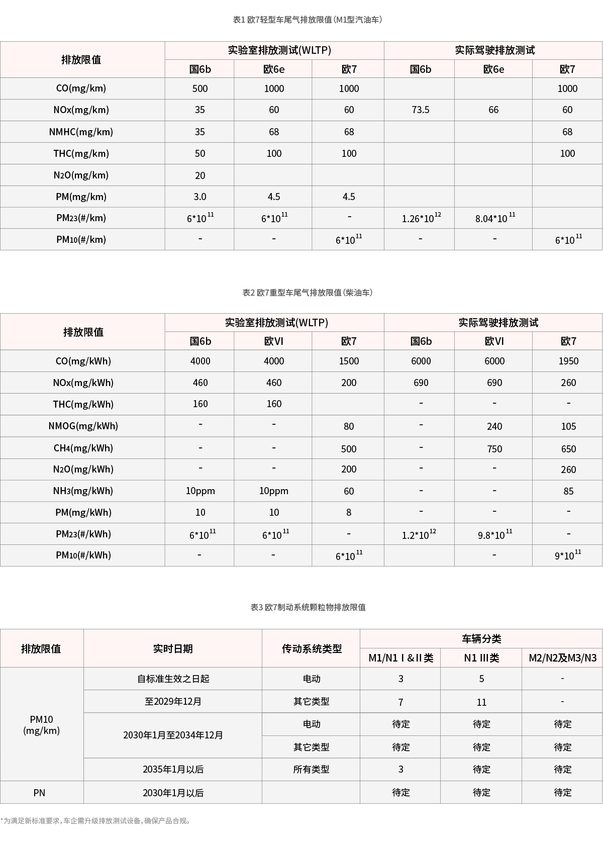 排放標(biāo)準(zhǔn)升級(jí)是機(jī)動(dòng)車污染減排的主要驅(qū)動(dòng)力。2024年歐盟發(fā)布的歐7標(biāo)準(zhǔn)不僅加嚴(yán)了尾氣污染物限值(表1-2),還新增了制動(dòng)系統(tǒng)和輪胎顆粒物排放檢測(cè)要求(表3)。我國(guó)生態(tài)環(huán)境部自2020年啟動(dòng)國(guó)七標(biāo)準(zhǔn)預(yù)研,目前第三期預(yù)研已進(jìn)入標(biāo)準(zhǔn)制定階段,國(guó)七標(biāo)準(zhǔn)即將出臺(tái)。